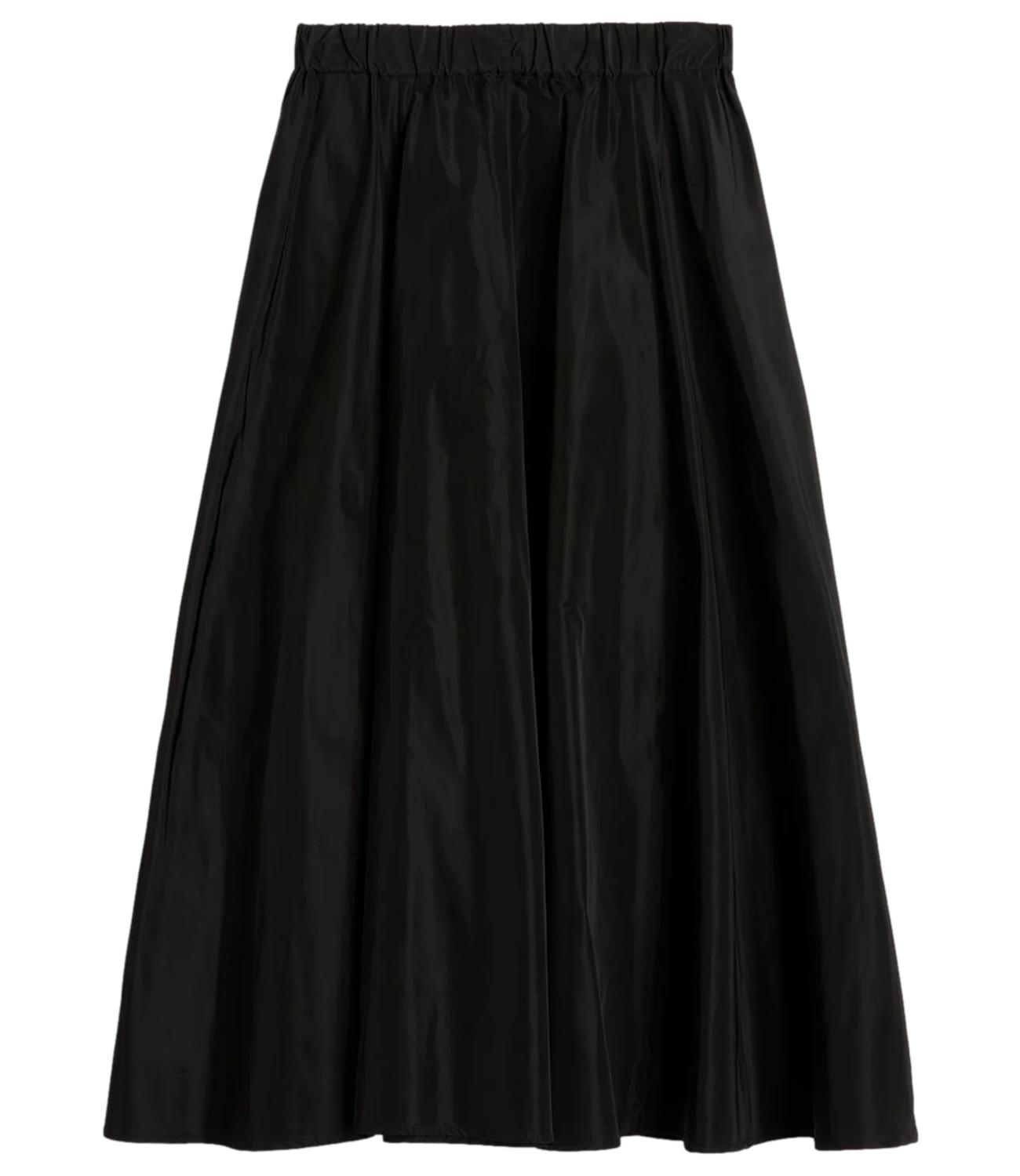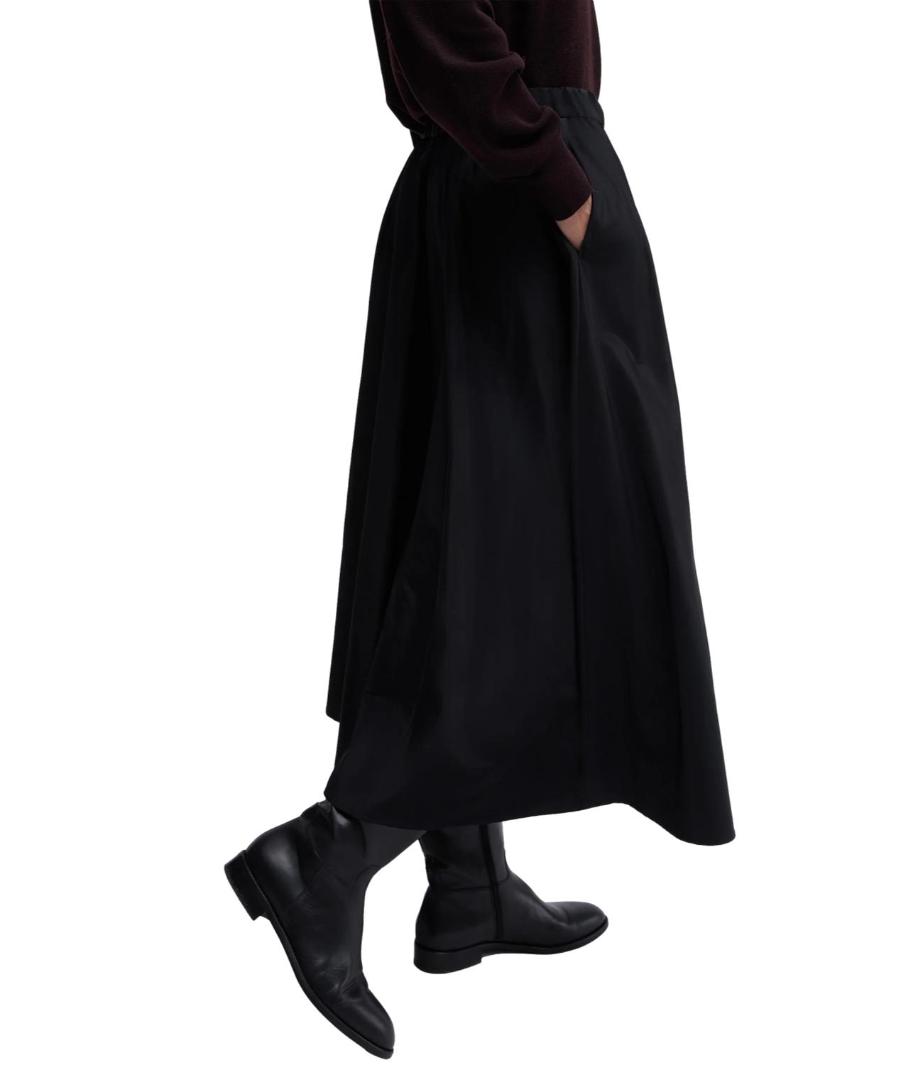 Gonna midi sfoderata a pieghe con fondo ampio realizzata in tessuto tecnico dall'effetto lucido. Modello dotato di un elastico in vita e tasche laterali.