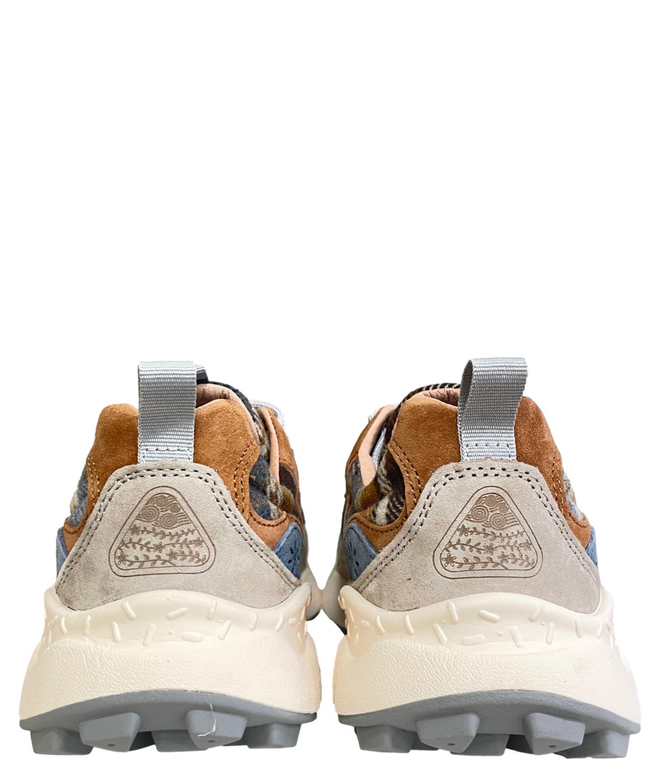 Sneaker in tessuto tecnico e inserti in suede multicolor e tomaia in lana. Occhielli rinforzati e lacci trek. Soletta interna in sughero naturale antibatterico, fondo in gomma ultra leggera con battistrada dentellato.