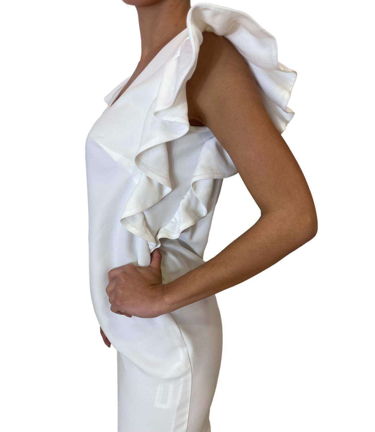 Abito regular a tubino mini, scollo a V, zip sul retro per apertura, e con rouches sul giromanica.