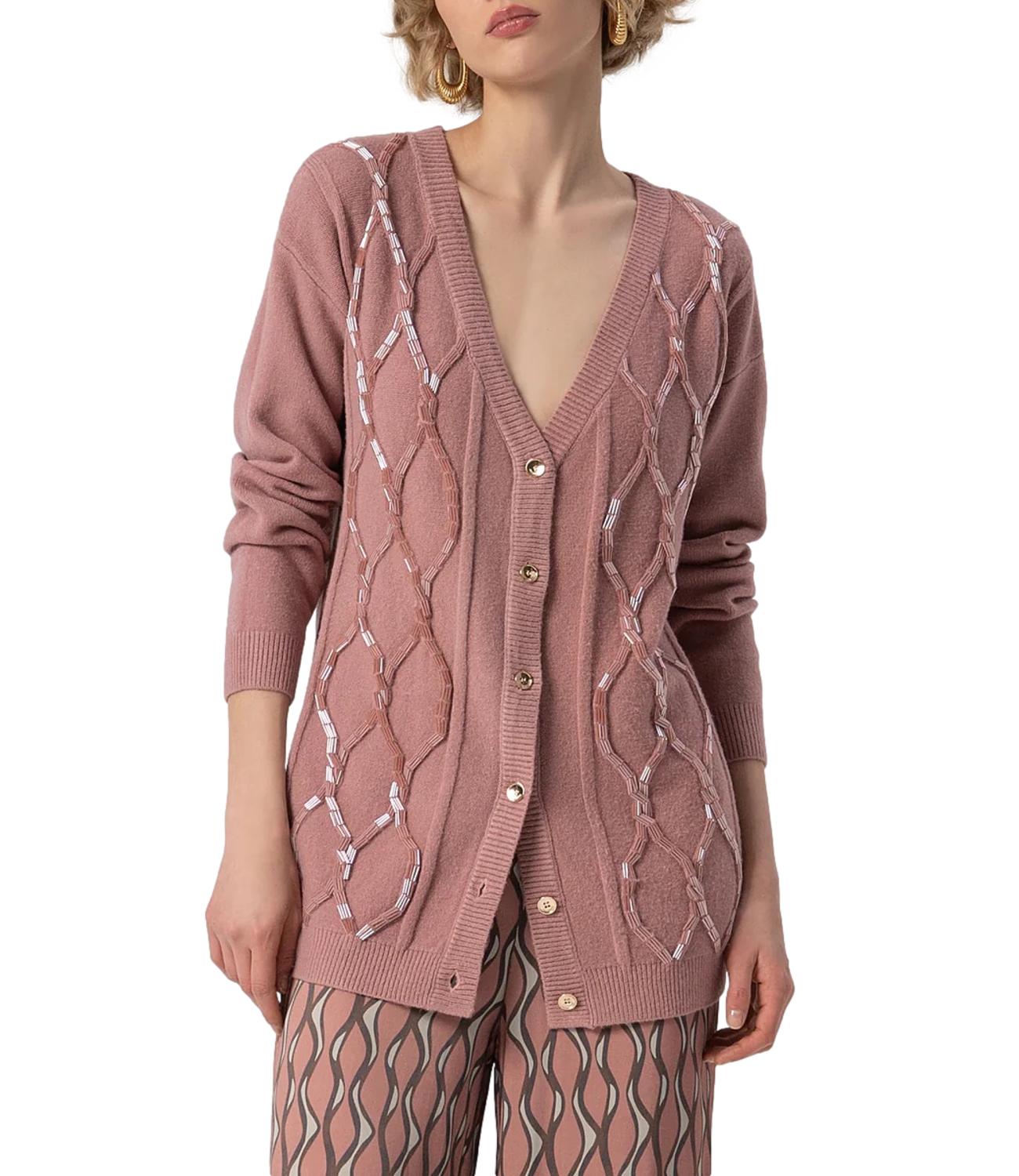 Cardigan over con punto treccia e baguette applicate, scollo a V, bottoni centrali per apertura, e con maniche lunghe.