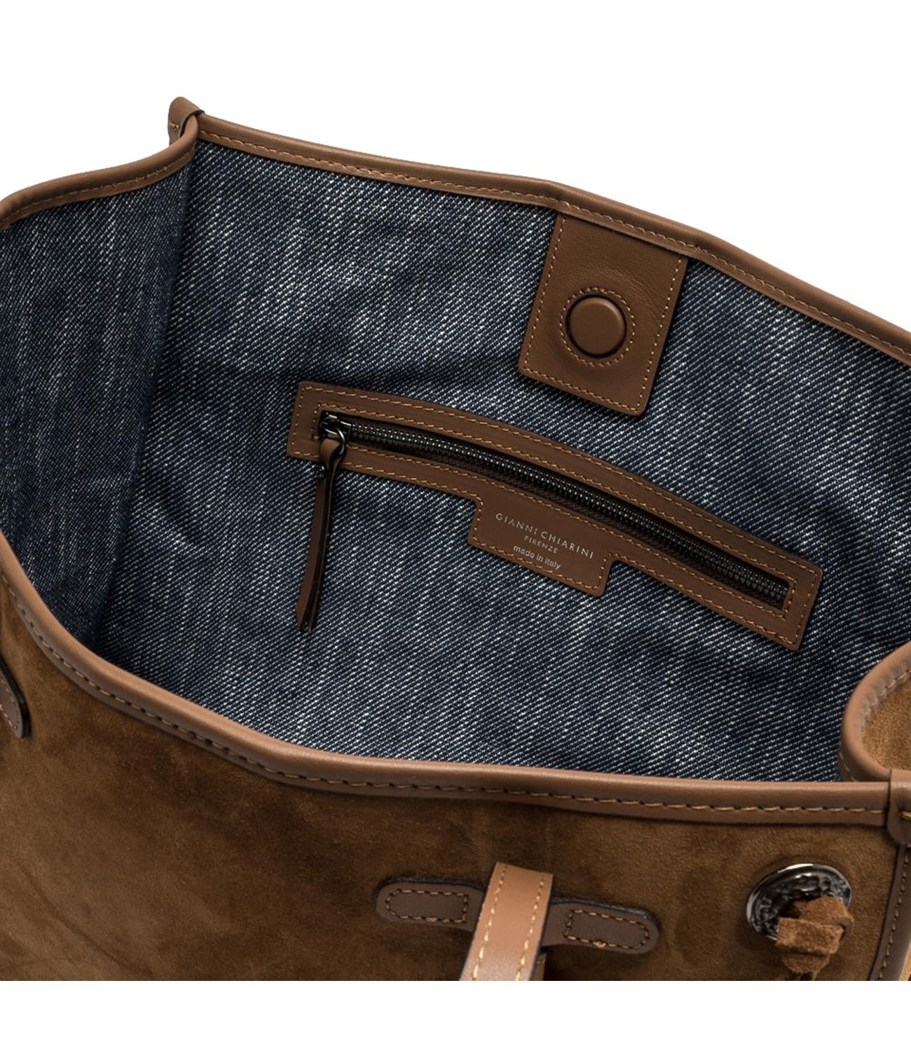 La shopping Marcella by Gianni Chiarini Firenze è realizzata in pelle scamosciata dal tocco morbido e setoso, arricchita da frange in pelle in tono e da borchie. Dotata di manici in pelle e di una comoda chiusura tramite magnete, è ideale per la vita quotidiana. Il design è arricchito da profili in pelle che donano alla borsa un tocco di eleganza.
