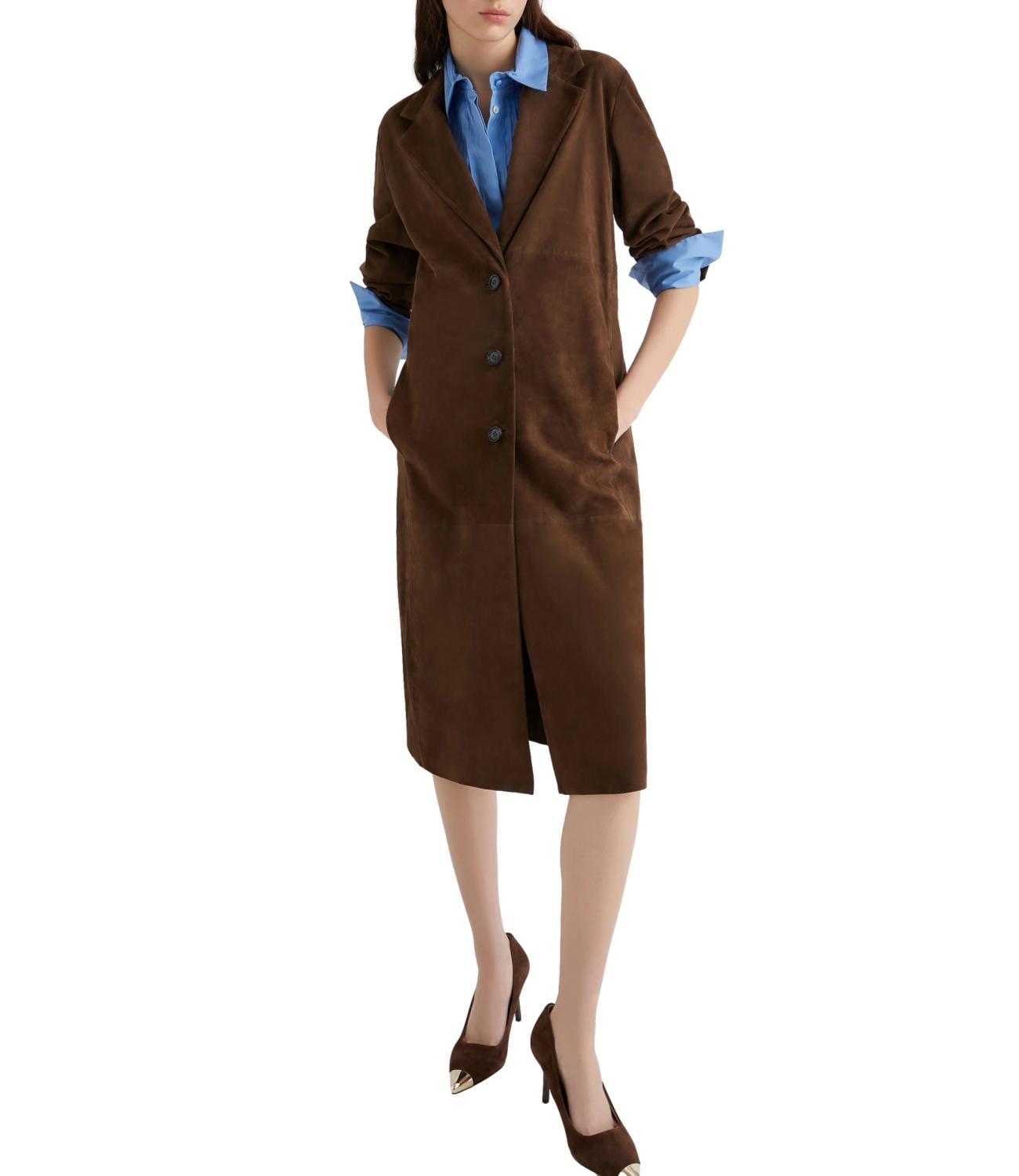 Trench in morbido suede con sorprendente allure metropolitana. Perfetto con camicia in denim e mini gonna coordinata, crea nuovi look strato su strato per arrivare con stile fino alla stagione fredda.
