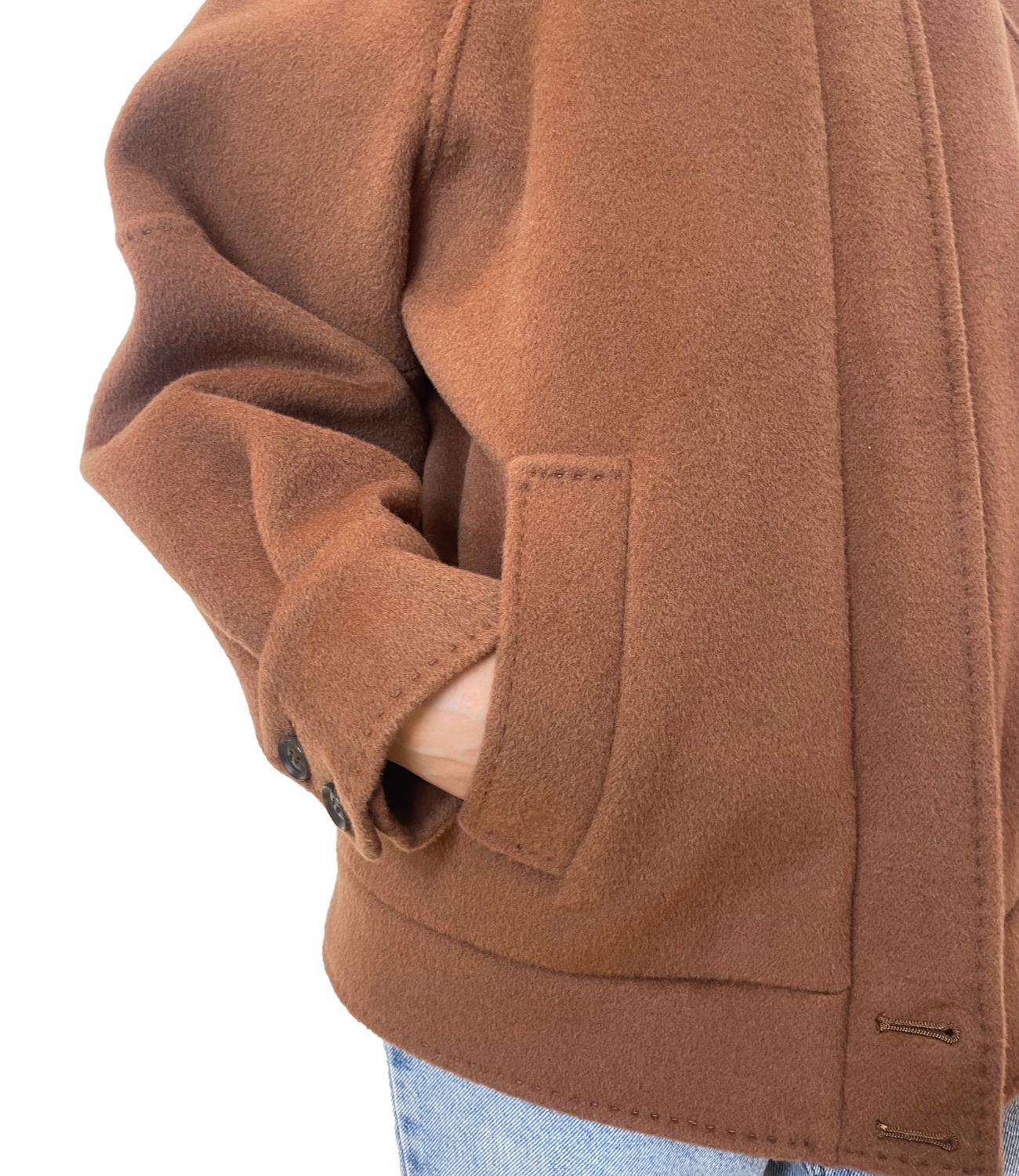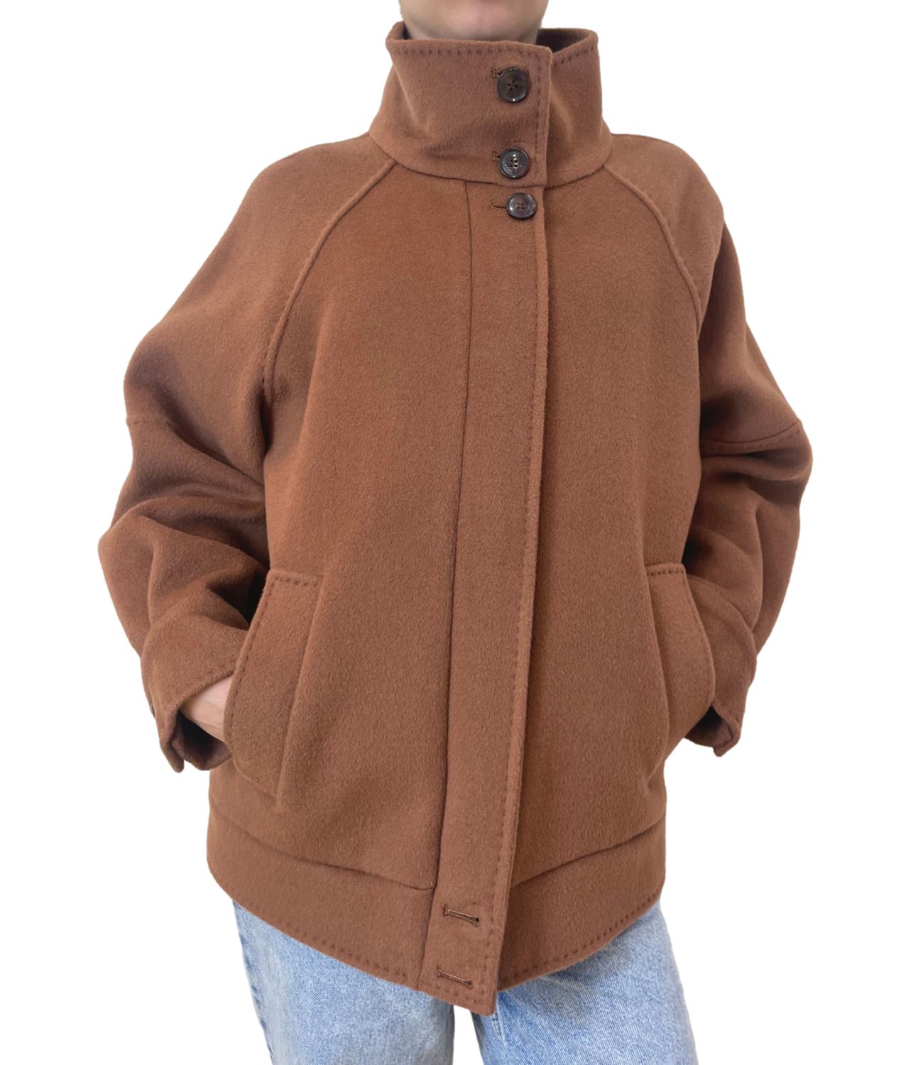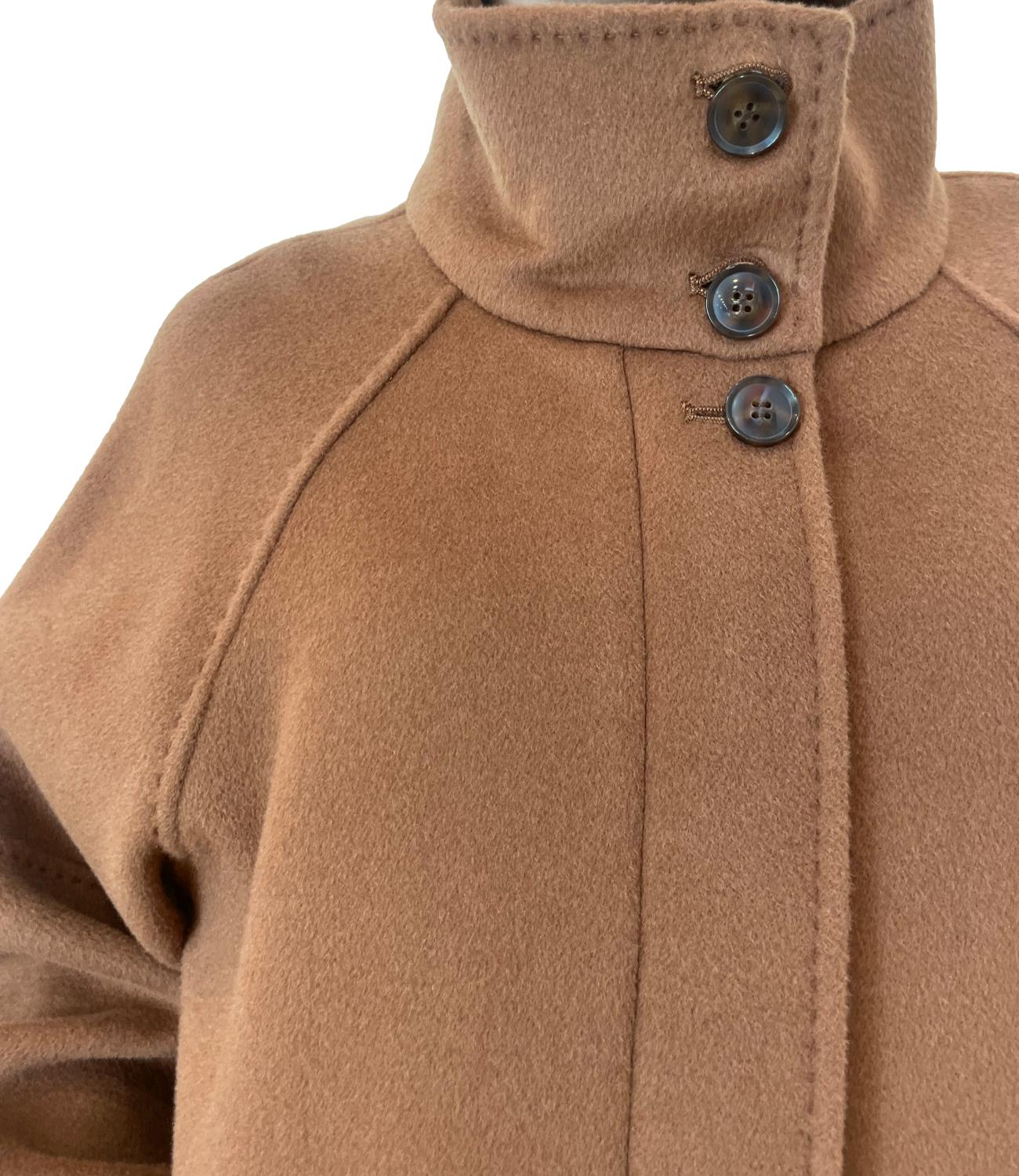 Giaccone in double di lana e cashmere dalla linea over. Collo in piedi con bottoni e maniche raglan. Chiusura a cerniera coperta a doppio cursore e tasche laterali a filettone. Impunture a vista lungo i profili. Polsini con bottoni. Foderato.