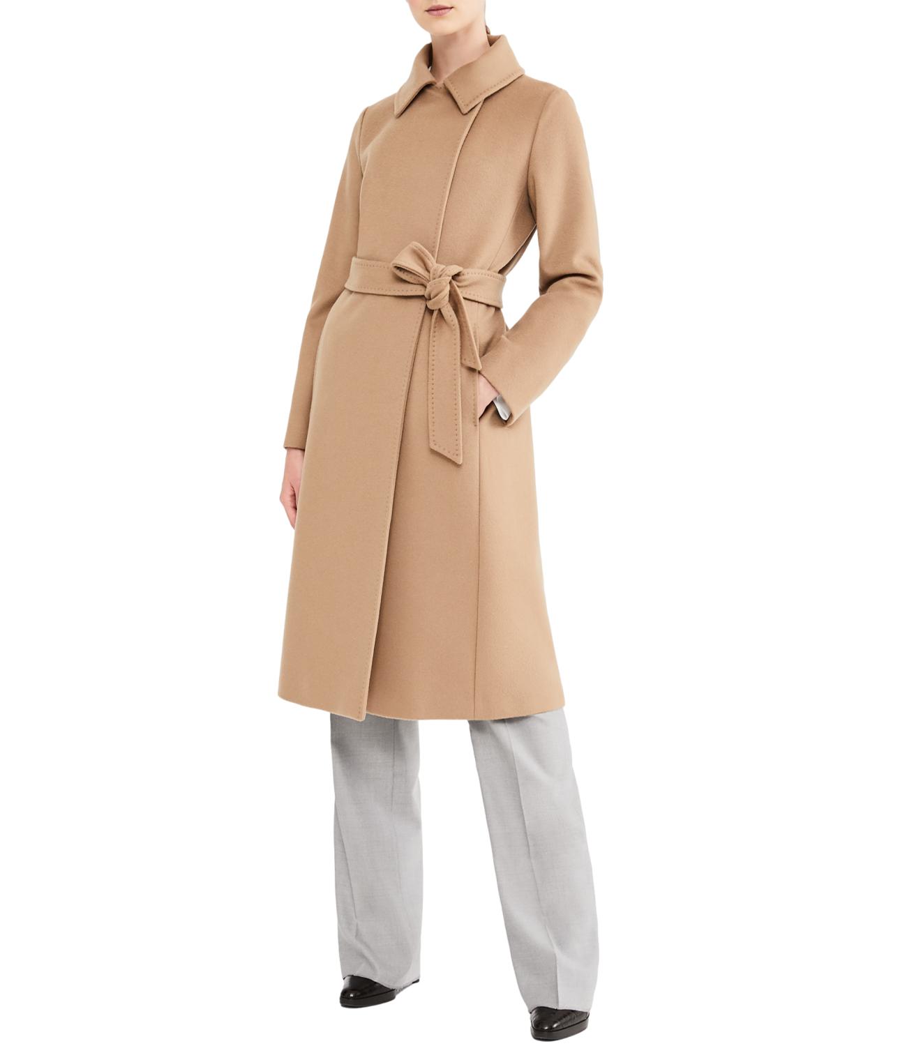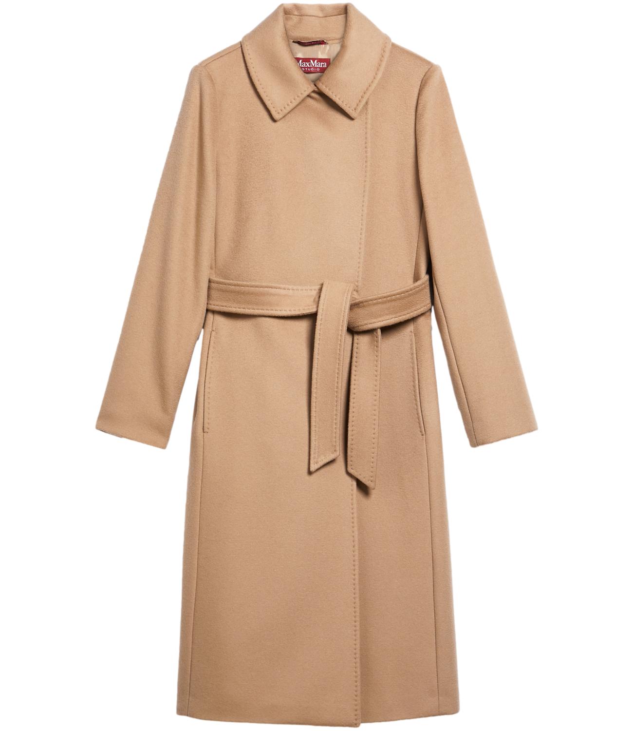 Max Mara Studio cappotto lungo beige cammello donna in lana pettinata dalla silhouette a vestaglia con spacco sul retro e cintura in vita