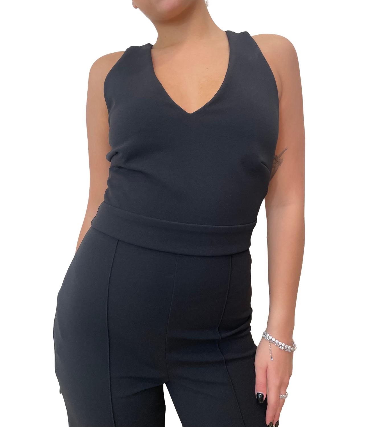 Realizzata in scuba mano crepe parzialmente riciclato, presenta spalline sottili incrociate sul retro, impreziosite da un fiocco cucito. Lo scollo a V valorizza il décolleté, mentre i pantaloni ampi con piega cucita donano armonia alla silhouette. La chiusura con zip laterale garantisce una vestibilità impeccabile.