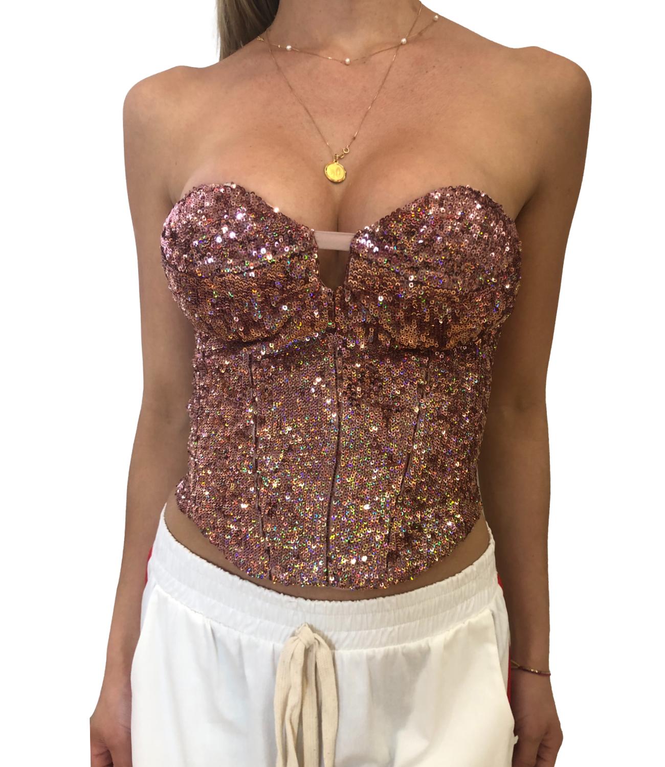 Top Silence Limited di colore verde, modello bustier interamente ricoperto di pailettes, scollo a cuore con coppe preformate leggermente imbottite, chiusura con zip sul retro. La vestibilita' è regolare.