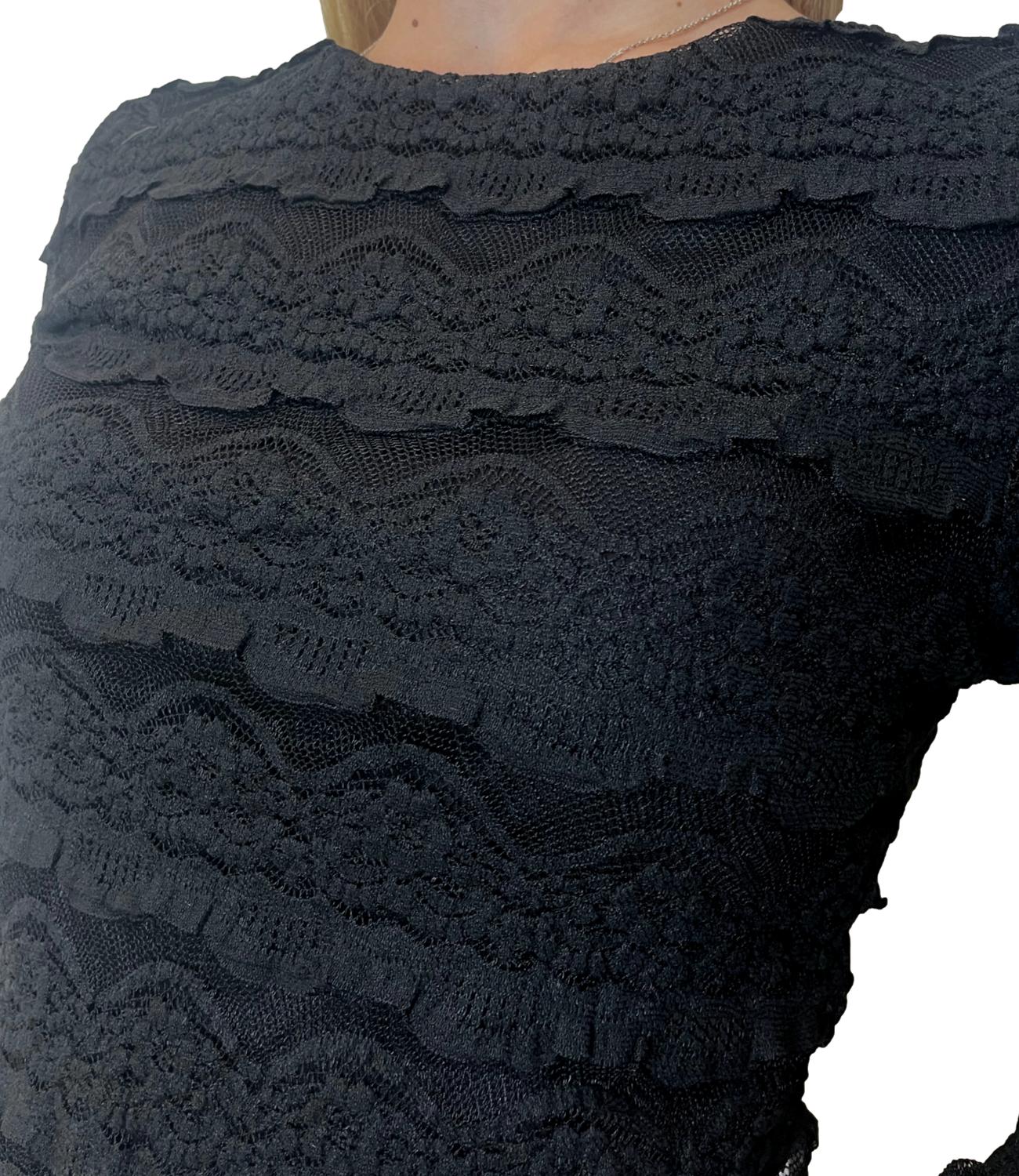 Top in pizzo elasticizzato, in doppio strato davanti, manica lunga, vestibilità aderente.